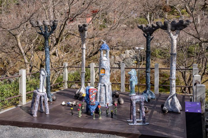 <写真>屋外での展示風景より、京都を拠点とする韓国出身の作家リュ・ジュユンの陶芸作品。