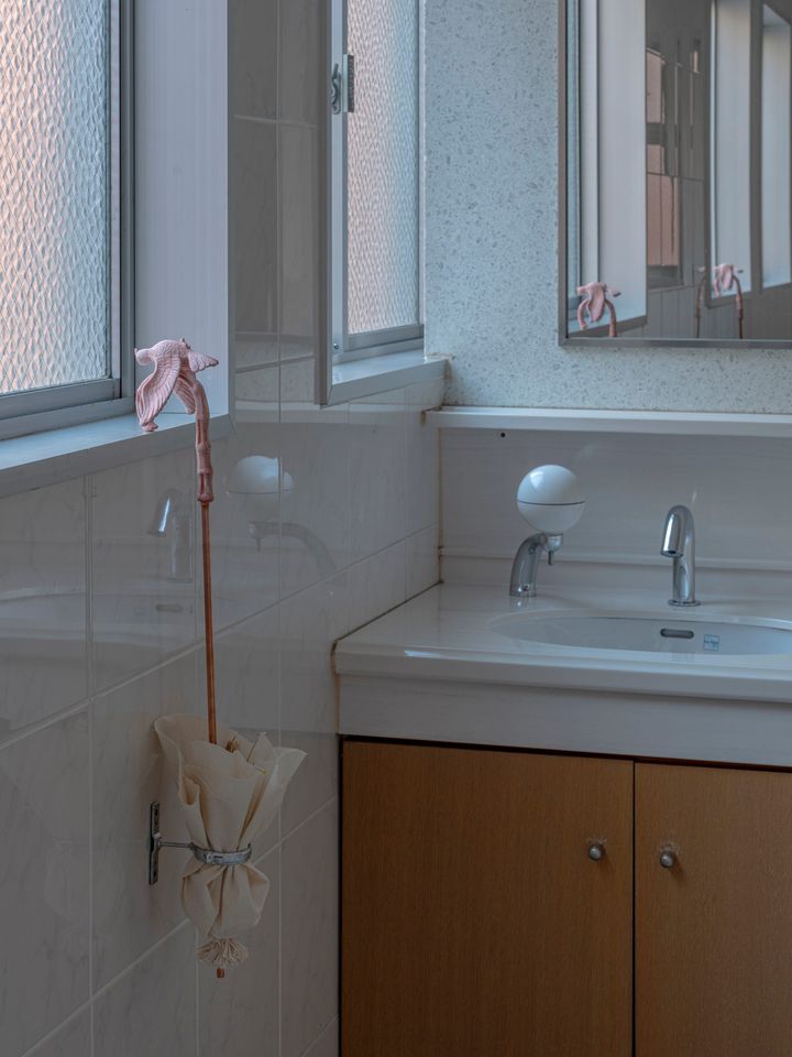 優秀賞を受賞した髙橋凛は会場内のトイレに作品を展示。移動を規定する指標と、そこからこぼれ落ちる存在について考察する作品で、折りたたみ傘の柄に渡り鳥を組み合わせた彫刻や工場の温度記録表と星座表を重ねたシルクスクリーン、傘が回転する映像などを展開している。偶然的にこの場所での展示となったそうだが、トイレというごく日常的な空間と作家の作品性が調和しており、没入感のある鑑賞体験となった。