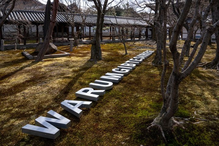 <写真>展示風景より、大巻伸嗣の作品。本年度は天橋の周辺庭園、日本画家・堂本印象の蒼龍図が天井を飾る本堂前、静謐な大慧殿周辺など、屋外空間へも展示エリアを拡張している。