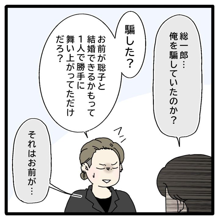 「総一郎・・・俺を騙していたのか?」正志が体を震わせながら問いかけると、総一郎さんは悪びれる様子なく「騙した?お前が聡子と結婚できるかもって1人で勝手に舞い上がってただけだろ?」そう言って、ショックで立ち尽くす正志を鼻で笑いました。