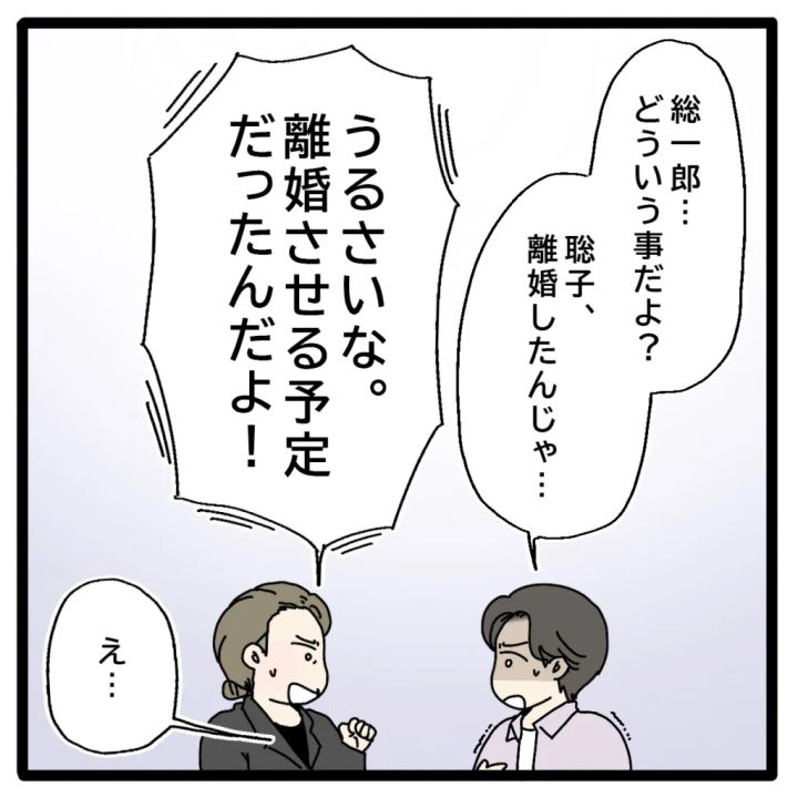 「総一郎どういう事だよ?聡子、離婚したんじゃ・・・」震える声で正志が問い詰めると、総一郎さんは焦った様子で「うるさいな!離婚させる予定だったんだよ!」と声を荒げます。その言葉を聞いた瞬間、正志は言葉を失い、固まってしまいました。