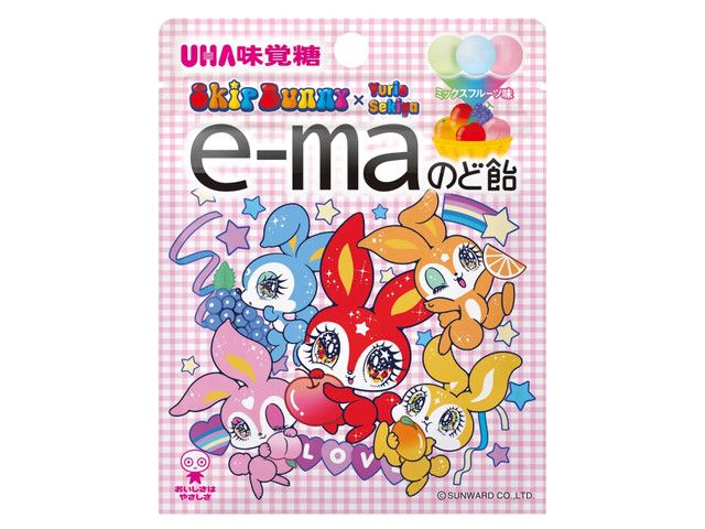 平成13年の発売以来、若者や働く女性を中心に支持されてきた「e-maのど飴」と、平成10年に誕生しカラフルでキュートな姿で愛されてきた「スキップバニー」が、夢のコラボレーションを実現しました。本コラボ商品は、商品化を目指す大学ゼミ対抗のインターカレッジ「Sカレ」において、見事1位に輝いた同志社大学の学生たちが考案。「スキップバニーの再興」をテーマに、若者が感じる「平成レトロ感」と「お菓子」を掛け合わせ、「スキップバニーと一緒に、リフレッシュと彩りを」というコンセプトのもと誕生しました。 「スキップバニー」のキャラクター名が、ベリー、ピーチ、ライム、アプリコット、パインといったフルーツ由来であることから、カラフルな超多層構造のキャンディで、一粒で次々と味が変化し、たくさんのフルーツ味を楽しめる「e-maのど飴 カラフルフルーツチェンジ」を採用。 パッケージは、人気イラストレーター「せきやゆりえ」さんがデザイン。特徴的なキラキラとした瞳の中には、「スキップバニー」それぞれの個性を象徴する“ハッピーシンボル”として、スター(ベリー)、ムーン(ライム)、シャイン(パイン)、フラワー(アプリコット)、ハート(ピーチ)が描かれています。さらに、ハートや虹などの平成レトロなモチーフをあしらい、バニーたちのキュートさを最大限に引き出したデザインに仕上げました。 仕事や勉強の合間、リフレッシュしたいときに、カラフルで前向きなひとときを届ける、特別な「e-maのど飴」をぜひお楽しみください。