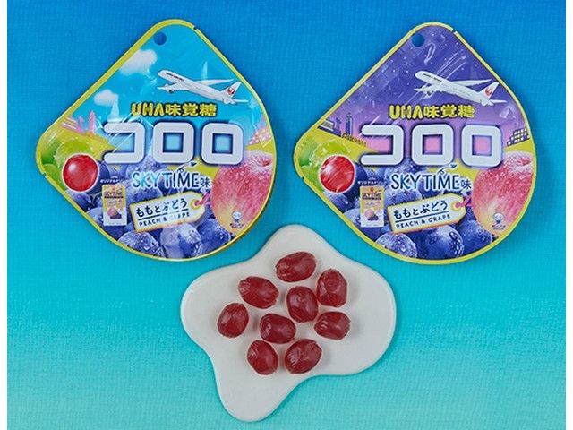 JALとコラボした、独特な食感が特徴のコロロのももとぶどう味です。 ローソンで販売
