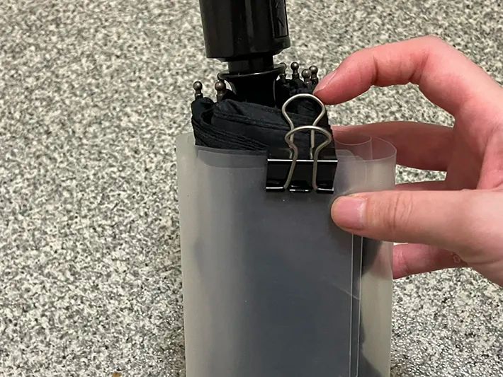 そこで、カバンに入れて持ち運べる文房具を組み合わせて、即席の傘ケースを作ってみます。