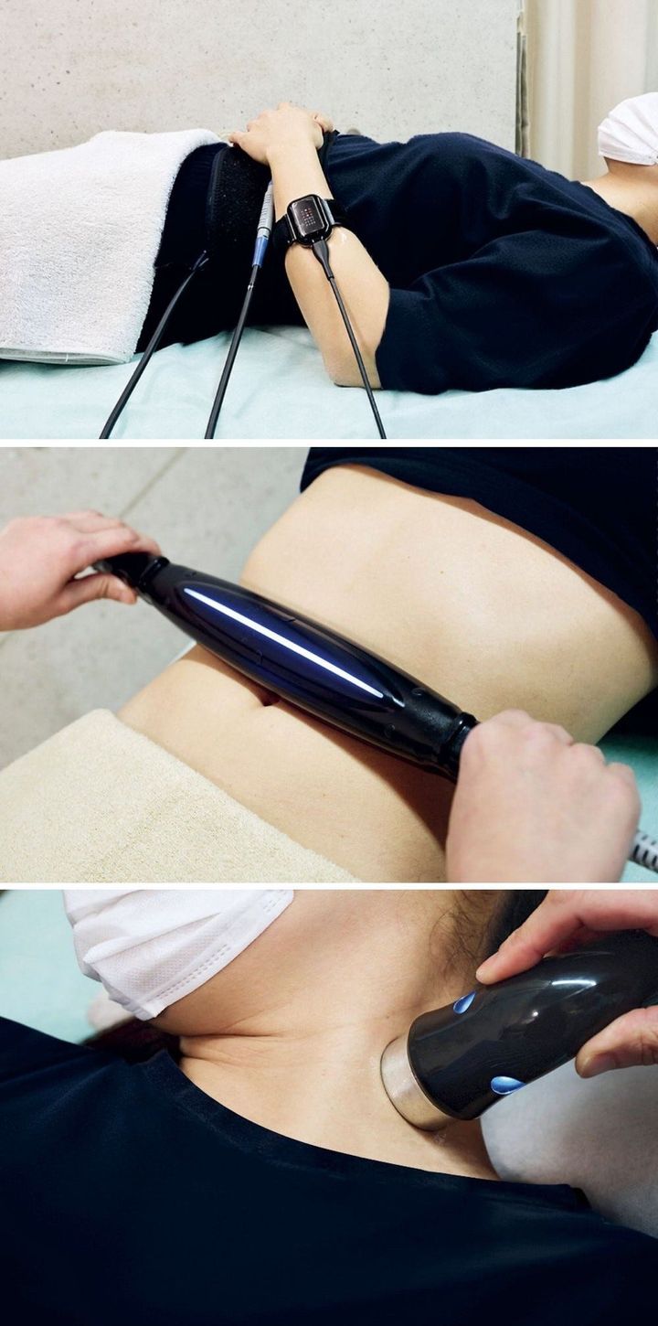 〈上〉ラジオ波と呼ばれる高周波を使用して、全身に温熱を加える「ラジオスティム」。「両手首と両足首に装着して体を温めることで、理想のコンディションを目指すことができます」<br>〈中〉「キャビリポデュアル」は、通常のキャビテーションの約3倍の出力で、パワフルに働きかける。「年齢による体の変化に悩んでいる方におすすめです」<br>〈下〉超音波マシンとハイボルトマシンをつないで超音波と高電圧の電流を同時に出す「ハイボルト超音波」。肌にハリを与え、ヘルシーな印象に導く。「特に年齢の出やすい首元や手の甲、足の甲に人気がある施術です」(山口さん) 撮影=セドリック・ディラドリアン