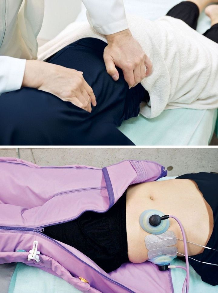 〈上〉初回の来店時は最初に身体データを測定。体のコンディションを確認したうえで、柔道整復師の資格をもつスタッフが施術を行う。「骨格にアプローチすることでこのあとに続く施術の効果をより実感しやすくなります」(山口さん)<br>〈下〉約40分間、100ボルト以上のハイボルトEMSを使用して体に働きかける。「空圧ポンプを下半身に装着して深い呼吸を促した状態で電気を流すことで、より効果的にインナーマッスルのトレーニングができます」(山口さん) 撮影=セドリック・ディラドリアン