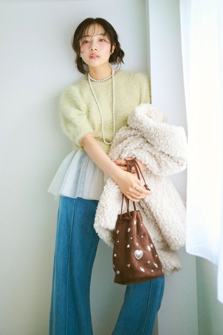 チュールスカートは着回し。モヘア半そでニット 9,900円/COCO DEAL(ココ ディール)デニムパンツ 3,490円/神戸レタス ネックレス 29,700円/アビステ コート 38,500円/HONEY MI HONEY バッグ 11,000円/カカトゥ(アンビリオン)ストーンリング 7,900円/TUWAKRIM、シルバーリング 17,380円/aura(ともに805showroom)