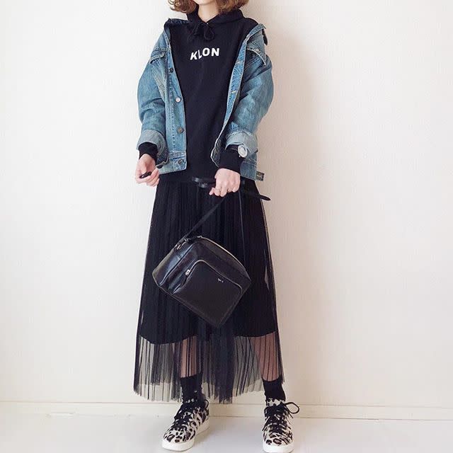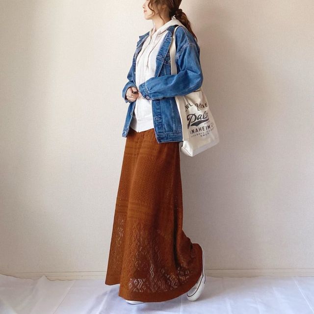 パーカーに似合うアウターといえば「デニムジャケット」。羽織るだけでサマになる上に季節感にもハマります。上半身がカジュアルなので、ボトムはきれいめにまとめるのが◎。女性らしいスカートを投入するとおしゃれなMIXコーデが楽しめますよ。