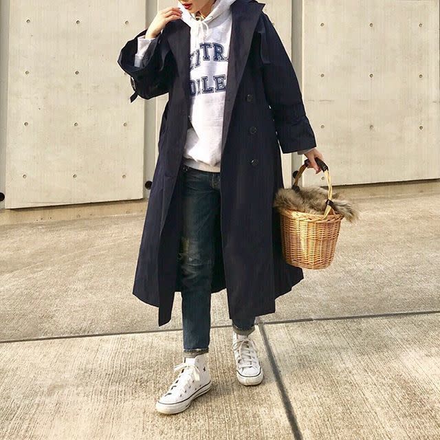 コーデするときはトレンチコートの上にパーカーのフードを出してアクセントにしてみましょう。クリーンに着こなせます。