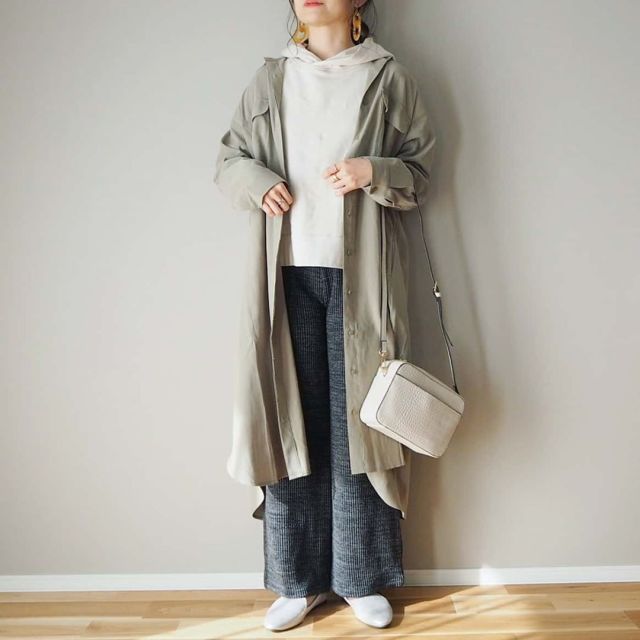 3月上旬はまだ気温が低く、しっかりとしたアウターが欠かせません。パーカーを大人っぽく着こなしたいときは「トレンチコート」がおすすめです。防風性を兼ね備えたアイテム展開が多いので、肌寒い春にうってつけ。