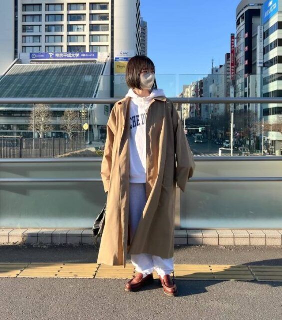 「トレンチコートは真面目すぎる」という方にはステンカラーコートがおすすめ。カジュアルなアイテムと相性がいいアウターなので、スポーティなパーカーに最適。スウェットパンツやスニーカーを合わせると春らしいコーデが完成します。