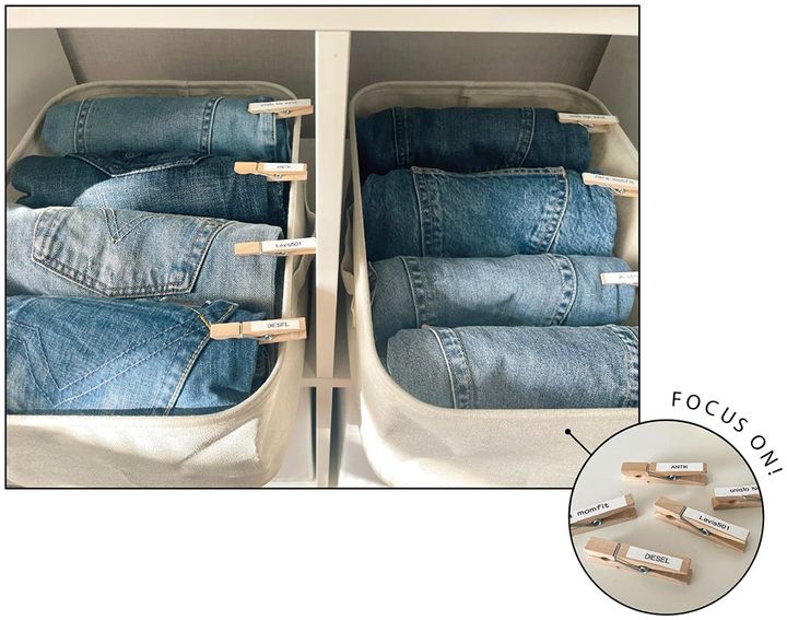 「無印良品で購入したソフトケースに大きく畳んだデニムを立てて収納しています。これではパッと見たとき、デニムの詳細がわからないのでブランドと形を記載したクリップを作成。服選びの時短にもつながりました」(インフルエンサー・3kiyさん)