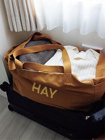 「なるべくかさばらないように、2つ折りにして平たく収納しています。薄手のものは無印良品のスタッキングシェルフに。ボリュームのあるものは、HAYで購入した大きな布バッグにIN。ニットを着ない時季には布バッグもたたんで保管できるので、場所をとらずに済むのが気に入っています。シーズンオフにはクローゼットの上の棚に移動」(sakiさん・会社員)