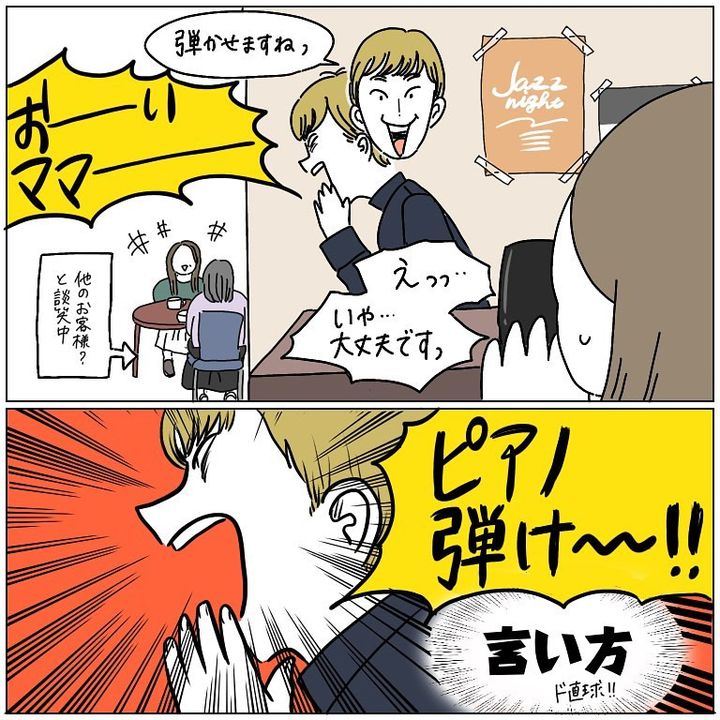 こんにちは!Instagramで日々の暮らしを漫画で紹介している、Web漫画家のmomoです。先日、レストランで食事をしていたとき、店内に置いてあったピアノが気になり、かる〜い気持ちで店員さんに聞いてみたんです。そうしたら予想外の人たちの間で大ゲンカが勃発し…え、なんでそうなるの!?