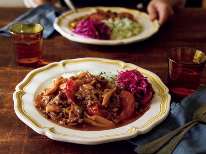 2種のきのことトマトのハッシュドビーフご飯』は、牛肉に玉ねぎ、トマト、きのこが入って栄養満点。フライパン1つでできて、一皿に盛り付けるだけだから、洗いものがほぼ出ないのもうれしいポイントです!