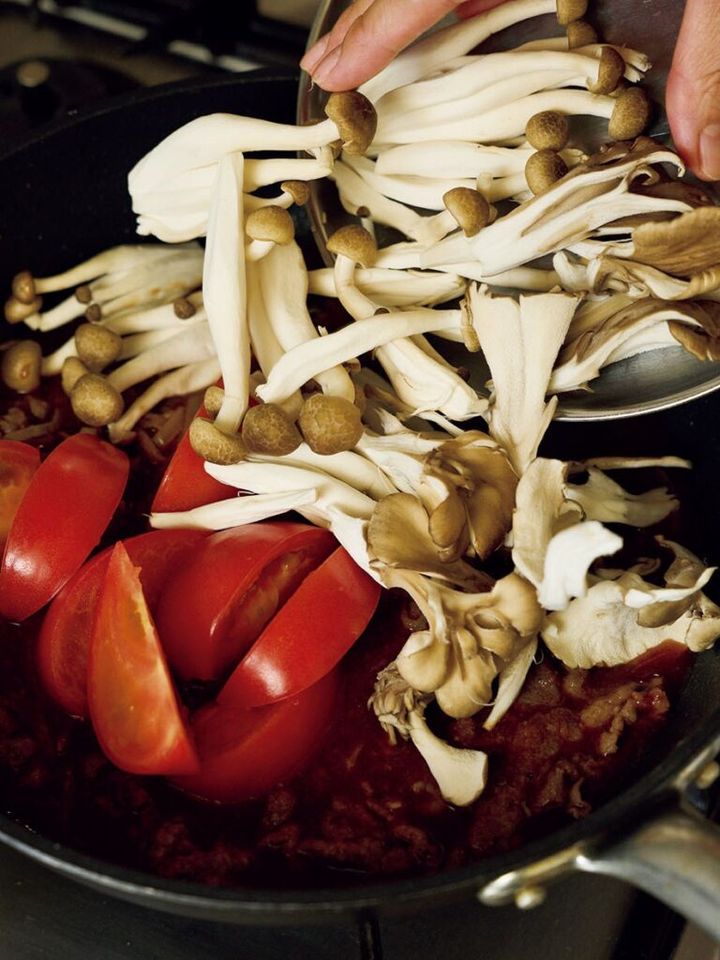 (3)〈A〉を加えて混ぜ、トマト、しめじ、まいたけを加える。煮立ったらときどき混ぜながら弱めの中火で3分ほど煮る。バターを加えて混ぜる。