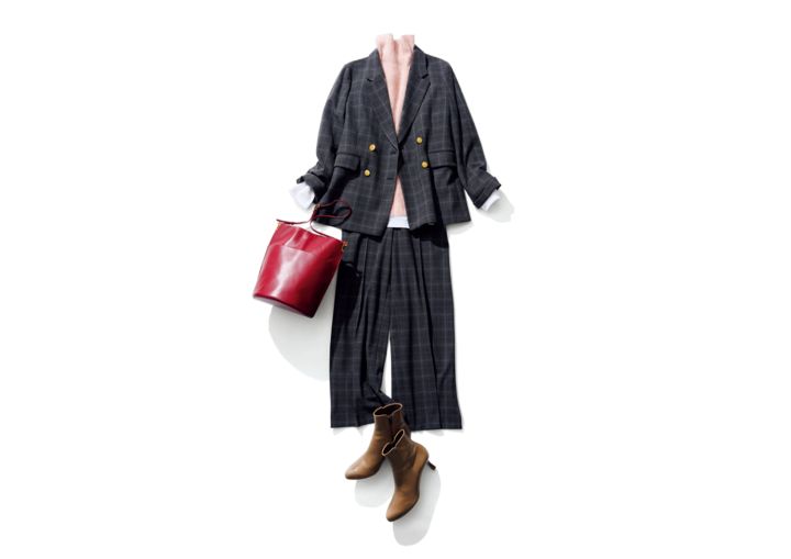 プリントTシャツ¥18,700/スリードッツ(スリードッツ表参道店) ジャケット¥17,990、パンツ¥9,990/ともにANYSIS(オンワード樫山) カシミヤベスト¥48,400/スリードッツ(スリードッツ表参道店) ショルダーバッグ¥6,490/カシュカシュ(アンビリオン) ショートブーツ¥31,900/ダイアナ(ダイアナ 銀座本店)