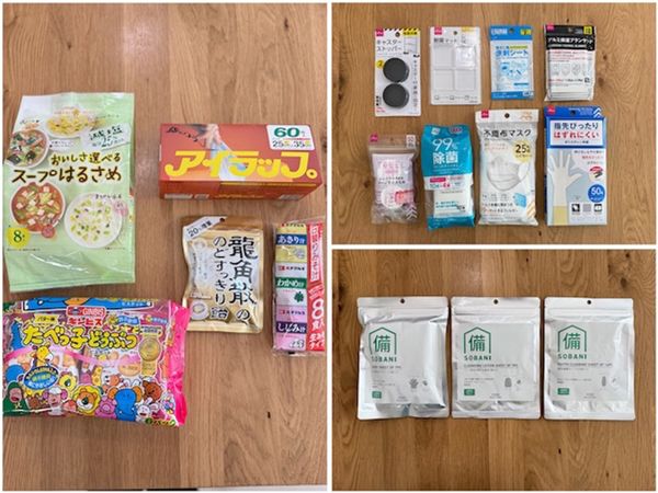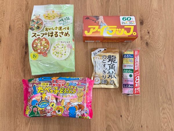 今回は、寒い時期を想定してインスタント味噌汁とお腹も満たせるスープはるさめ、乾燥対策としてのど飴、子どもが食べ慣れている個包装のお菓子などを購入しました。また、耐熱性が高く調理にも使える便利なポリ袋「アイラップ」も購入しました。
