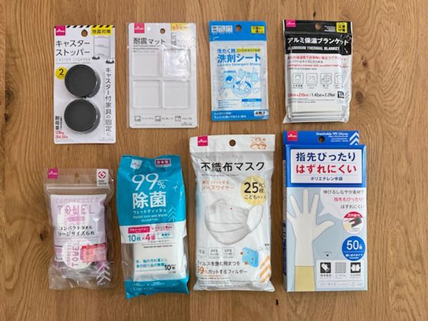 実際に購入したのは、家具の転倒を防ぐキャスターストッパーや耐震マット、洗濯洗剤がシート状になったもの、体温低下を防ぐアルミ保温ブランケット、ラージサイズの圧縮タオル、除菌ウェットティッシュ、不織布マスク、手袋などです。どれも1点あたり110円(税込)なので、8点購入しても880円で済みます。