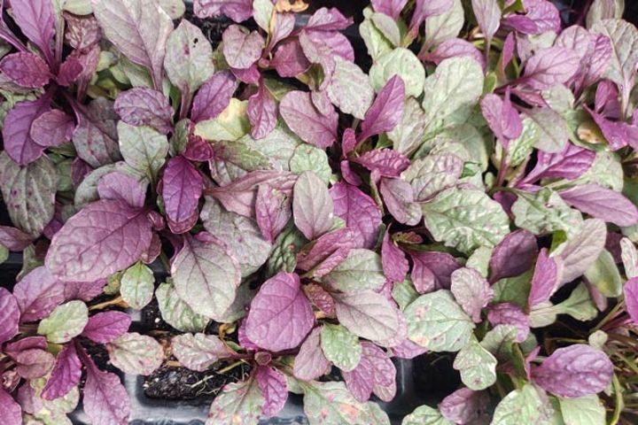 日本に自生するジュウニヒトエの仲間ですが、ヨーロッパなどから入った園芸品種が人気です。つやのある葉はブロンズ色を帯びたり、赤や白のグラデーションなどと多彩。4~6月には青紫色やピンクの花を咲かせます。強光で傷みやすく、日陰でよくふえます。
