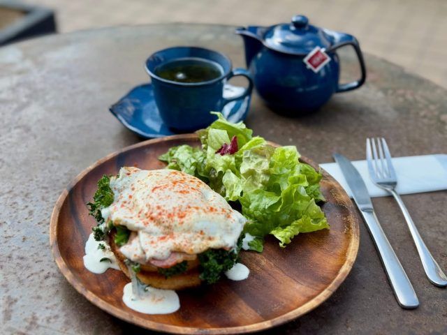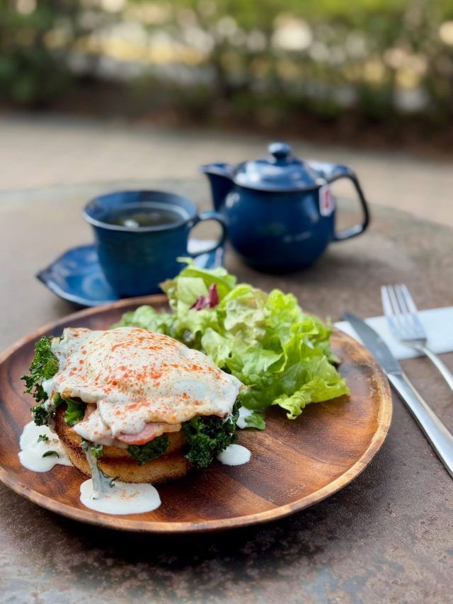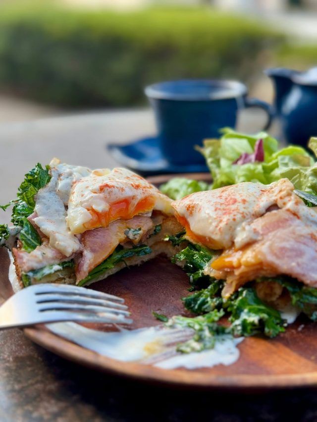 こちらはカジューエッグ。 トーストにケール、ベーコン、目玉焼きが重なり、カシューナッツソースが包みます。 クリーミーなソースとの組み合わせがおいしい、オリジナルのエッグベネディクトですね。
