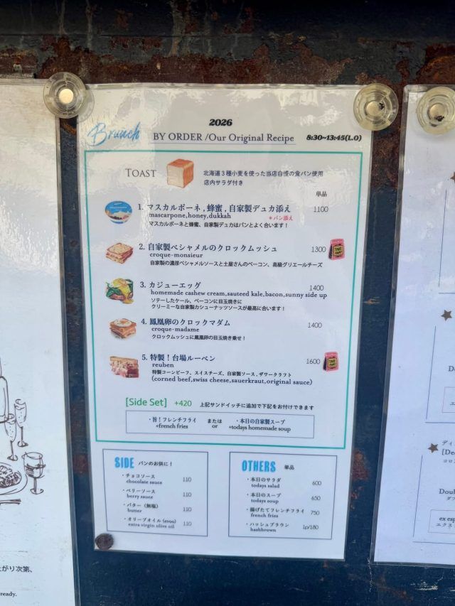 まずは、マスカルポーネ、ハチミツ、自家製デュカ添え。 トッピングでトーストを楽しむメニューです。 ほかにも、自家製ベシャメルのクロックムッシュ、カジューエッグ、鳳凰卵のクロックマダム、特製!台場ルーベンがあります。 どれもトーストが使われています。