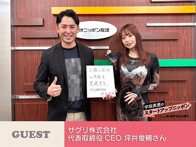 第60回のゲストにはサグリ株式会社の代表取締役CEOである坪井俊輔が登場。同社は衛星データや土地区画データを独自技術で解析し、農地の状態を可視化するサービスを展開しており「農地をより良い形で活用し、持続可能な農業の実現と地域活性化を目指している」と坪井は説明した。