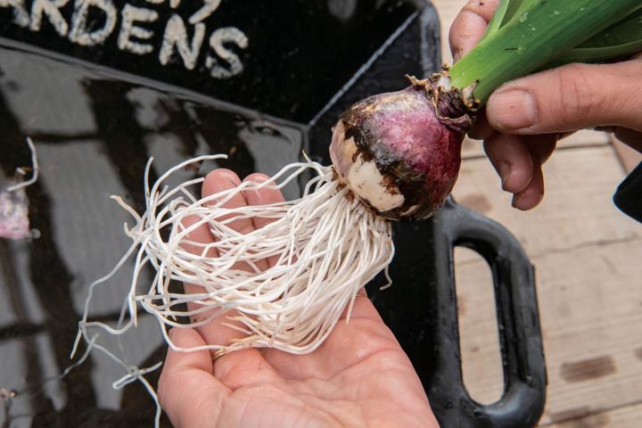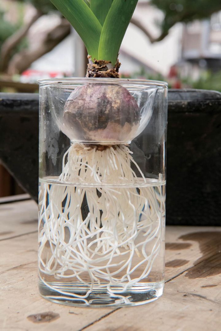 土がないぶん、病害虫がつきにくく、室内で香りを楽しみたい人やガラス容器で根っこ観賞をしたい人におすすめです。週に1回水を入れかえます。球根をポットから取り出す際に、根を傷つけないよう注意し、水を何度もかえながらゆっくり土を落とすようにしてください。花が咲き終わったら土に植えかえれば、来年もきれいな花を楽しめます。
