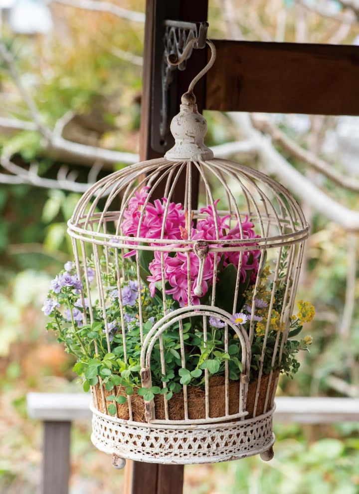 アイアンの壁掛けハンギングに、紫のヒヤシンスを合わせたシックな寄せ植え。色が暗くなりすぎないよう、ローズピンクのネメシアなどでグラデーションをつくっています。春になると、パルマスミレの白花が咲き、垂れ下がるように演出。ハゴロモジャスミンも徐々にほんのりピンクに紅葉し、アクセントに。ヒヤシンスだけでなく、パルマスミレも香りを楽しめます。