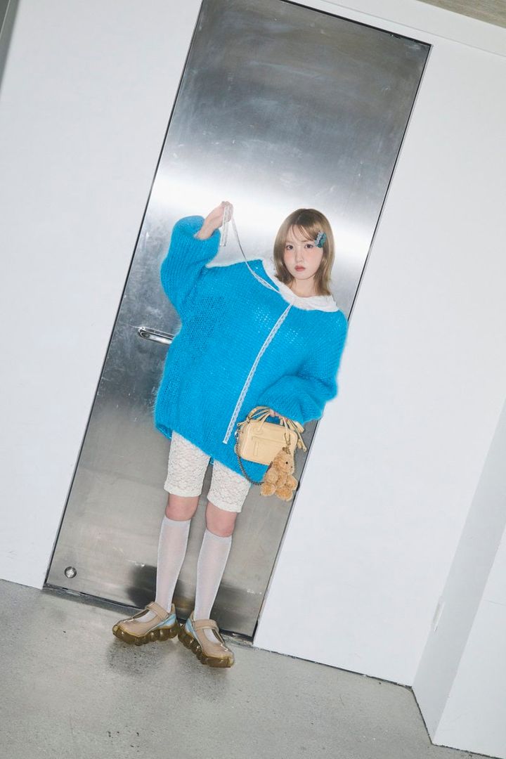 スニーカー[JEWELRY COCOON]¥36,300/グラウンズ(FOOLS Inc.)、ニット¥19,910/ミチ、レギンス¥5,940/ローズバッド(ともにローズバッド ルミネエスト新宿店)、インナートップス¥15,400/キャンディストリッパー、ヘアピン3set¥2,530/パクチートーキョー(ハチマルゴショールーム)、バッグ¥21,560/クリスティーンプロジェクト(HANA KOREA)、チャーム¥5, 490/マンゴ、ソックス¥1,320/靴下屋(タビオ)