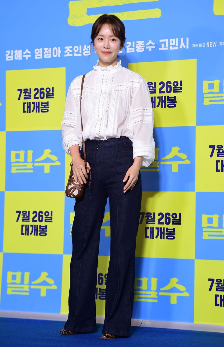 2023年7月20日、ソウル市内のMEGABOX COEXで開催された、映画『密輸1970』のVIPプレミアに出席しました。映画デートのときに参考にしたい、レースの白ブラウスにストレートデニムを合わせた清楚カジュアルコーデ。パンプスは柄物、ショルダーバッグはロエベを合わせて。