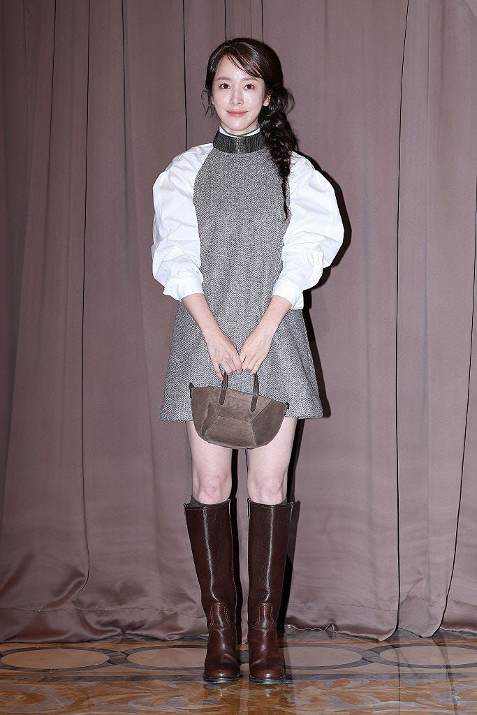 2025年10月23日、イタリアのラグジュアリーブランド、ブルネロ・クチネリのソウル旗艦店オープニングフォトコールにて。ホルターネックのヘリンボーンツイードドレスに、バルーンスリーブのブラウスを組み合わせました。ロングブーツとミニバッグ“BC Duo”はシックなブラウンを選び、サイドにまとめたヘアスタイルも大人キュート。