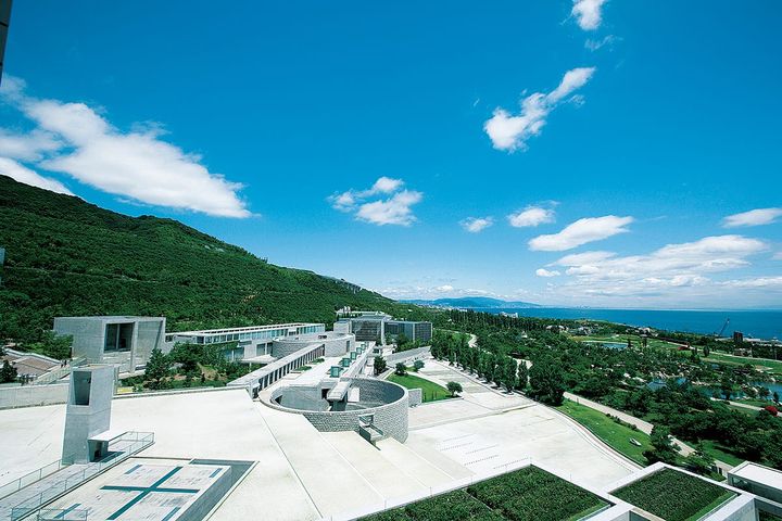 淡路島北部の丘陵地に広がる「淡路夢舞台」は、建築家・安藤忠雄さんによるグランドデザインで創られた複合施設。温室や野外劇場、レストラン、国際会議場、ホテルなどを備えています。「さまざまな動物や植物と人間が共生できる空間を創造すること」をテーマに、コンクリートと光、そして緑が響き合う空間は、訪れる人に深い静寂と感動を与えます。山の斜面に沿って階段状に配置された100個の花壇「百段苑」は、季節ごとに彩りを変える花々が咲き誇るスポット。晴れた日には、大阪湾を一望するダイナミックな眺望が広がり、建築と自然の調和が際立ちます。