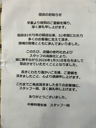 【閉店】54年の歴史に幕。三鷹北口の町中華「安楽」が1月末に閉店