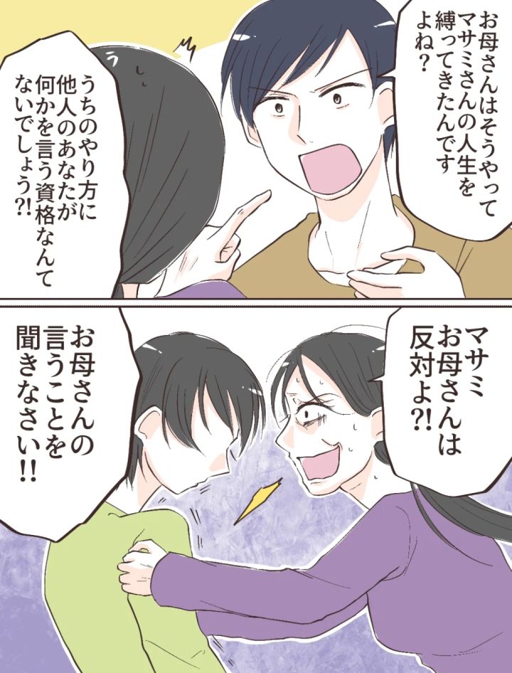 ケイスケさんが「そうやってマサミさんの人生を縛って来たんですよね?」と私の気持ちを代弁してくれますが、母は「うちのやり方に他人のあなたが何かを言う資格なんてないでしょう?マサミ、お母さんは反対よ!?お母さんの言うことを聞きなさい!」と、どこまでも私を縛るつもりでいるようです。このまま私の人生は、母に縛られたままなのかと思うと怖くなりました。