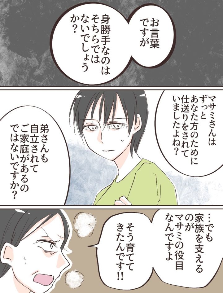 「お言葉ですが、身勝手なのはそちらではないでしょうか?マサミさんはあなた方のためにずっと仕送りをされていましたよね?弟さんも自立されてご家庭があるのではないですか?」それに対して「でも家族を支えるのがマサミの役目なんですよ。そう育てて来たんです!」と反論する母。私は母の言葉に、心がえぐられるような感覚がしました。