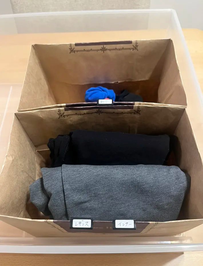 大きな衣装ケースの場合は、不要な紙袋で簡単な箱を作り、仕切り代わりにするのもおすすめ。