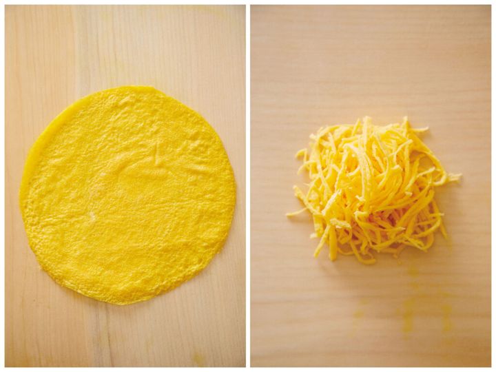 (2)フライパンを再び弱火にかけ、〈卵液〉の1/4量を流し入れて広げる。表面が乾いてきたら、菜箸1本を卵の下に通して持ち上げ、上下を返して10秒ほど焼き、取り出す。同様に合計4枚焼く。錦糸卵を作るときは、薄焼き卵を3つ~4つに切ってから重ね、横にせん切りにする。