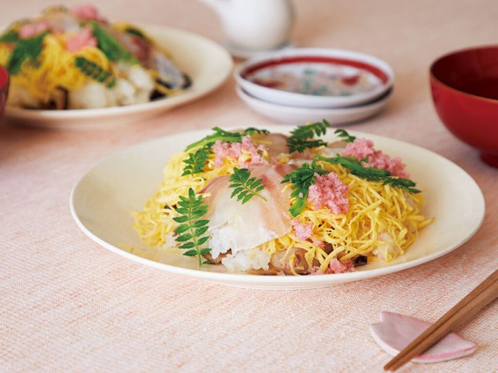 ひなまつりに、春らしい一皿を。ふんわり広がる錦糸卵に、つややかな鯛。桜でんぶのやさしいピンクが華やかさを添えて、食卓に並べるだけでぐっとお祝いムードが高まります。