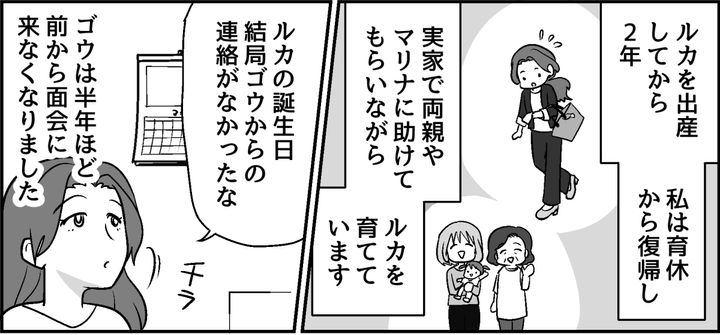 出産してから2年。私はルカを保育園に預けて仕事に復帰し、一緒に暮らす両親やマリナに助けられながら日々奮闘していました。しかしゴウは半年ほど前から面会に来ていません。先日はルカの2歳の誕生日だったのに連絡すらなかったのです。