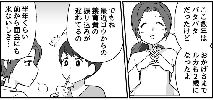 近頃は養育費の支払いも遅れがちで、先月の分がまだ振り込まれていません。メッセージを送っても既読スルー。そんななか、友人のマキから思いがけない事実を聞かされます。ゴウが再婚していて、新しい奥さんとの間の子どももいる……!? 私はショックを隠せませんでした。