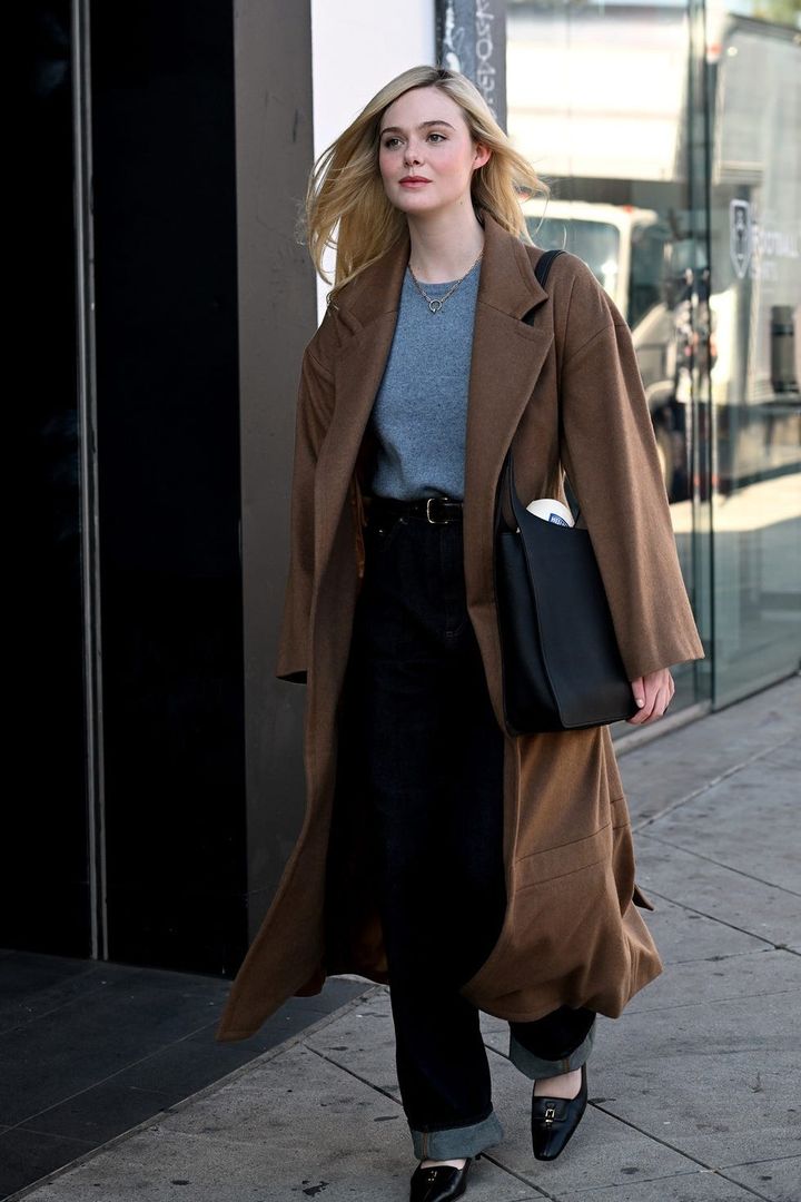 コートとセーター、そしてデニムの組み合わせ自体に真新しさはないかもしれない。けれど、エル・ファニングの方程式には、ルックを際立たせる絶妙なニュアンスが宿っている。
