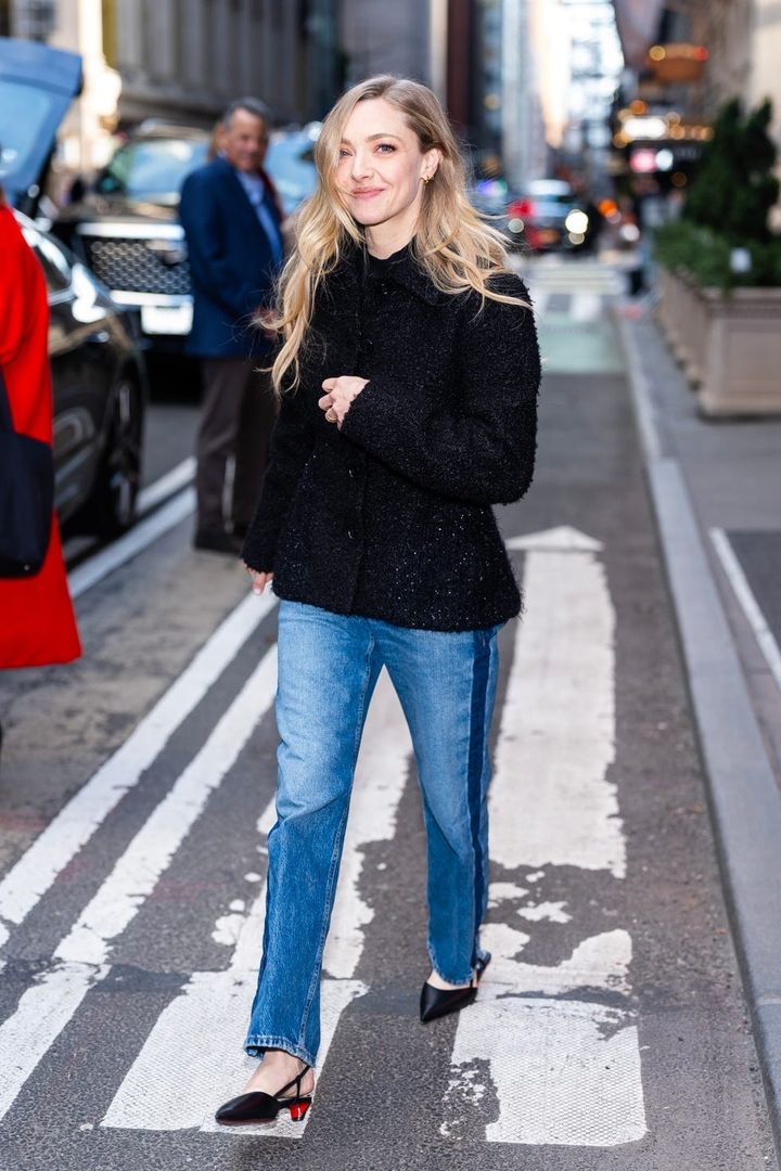 サイドストライプのデニムがトレンドの最前線に戻ってくるのは久しぶりだが、アマンダ・サイフリッドが見事にこのスタイルを復活させた。スタイリングの主役は、存在感のあるデニムにお任せ。タイムレスなボクシーブレザーを合わせて、洗練されたムードでまとめるのが正解。