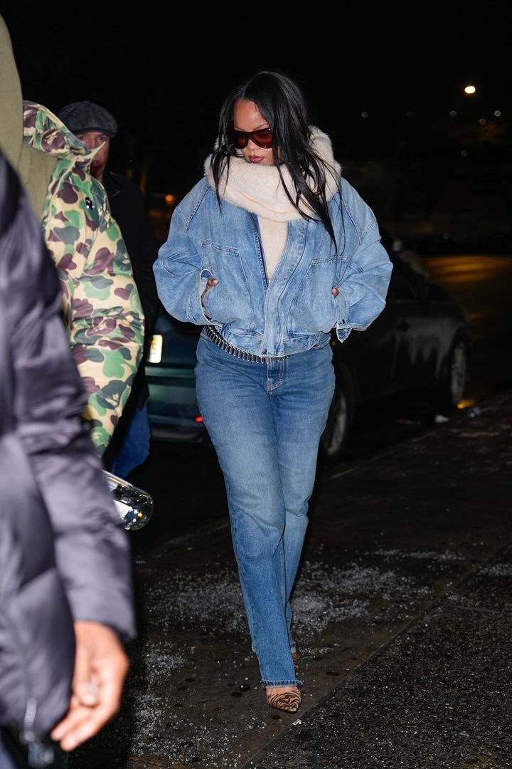 デニムに合わせるアイテムに迷ったら、トップスもデニムを取り入れてみて。リアーナは、ダウンジャケットやコートの代わりにデニムのボンバージャケットを選び、このペアリングを冬仕様にアップデート。首元にマフラーを巻くことで、オールブルーの着こなしにメリハリを効かせている。