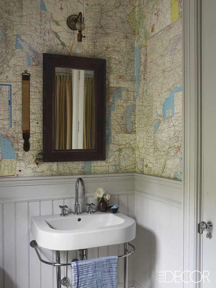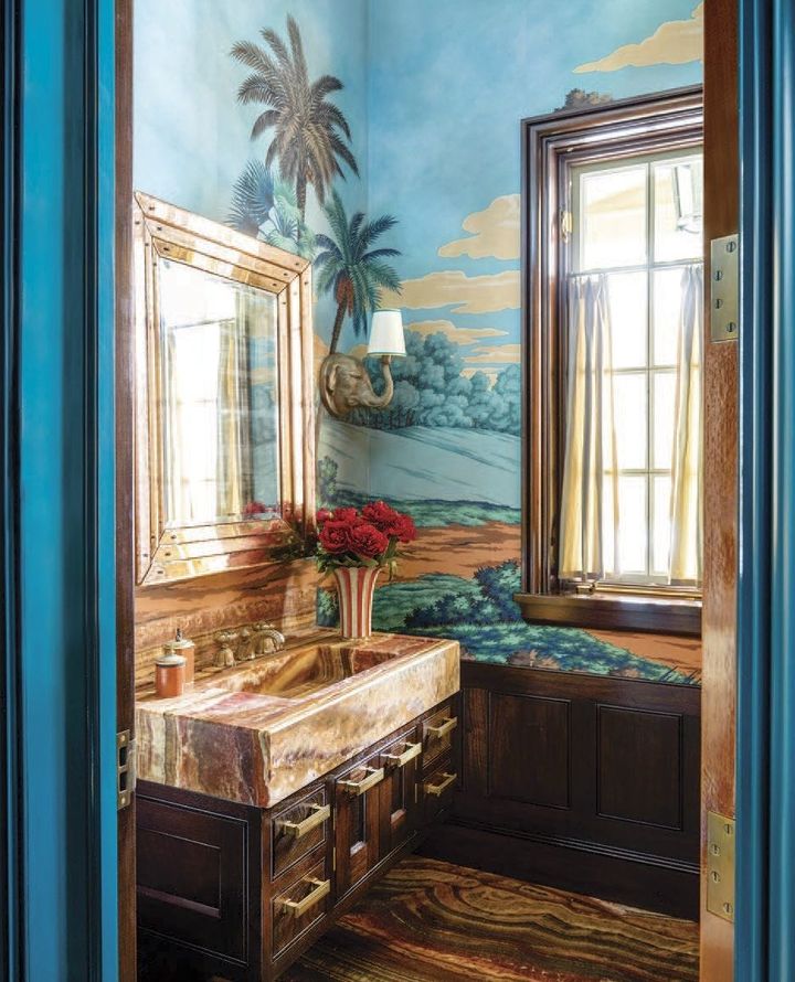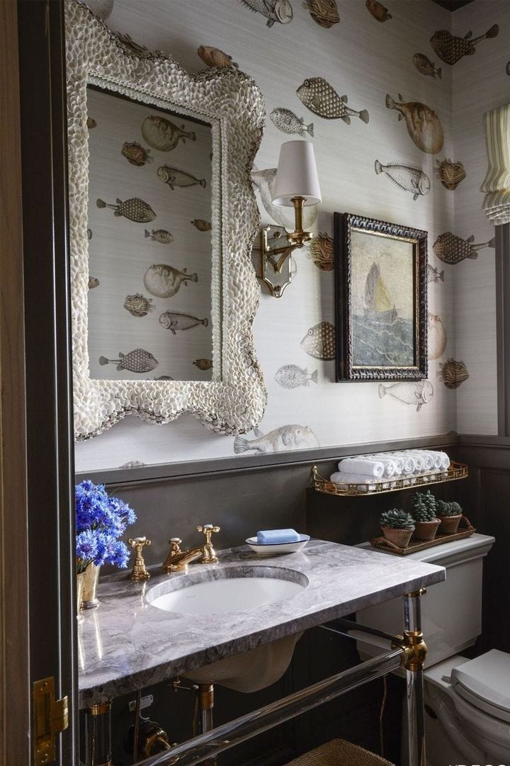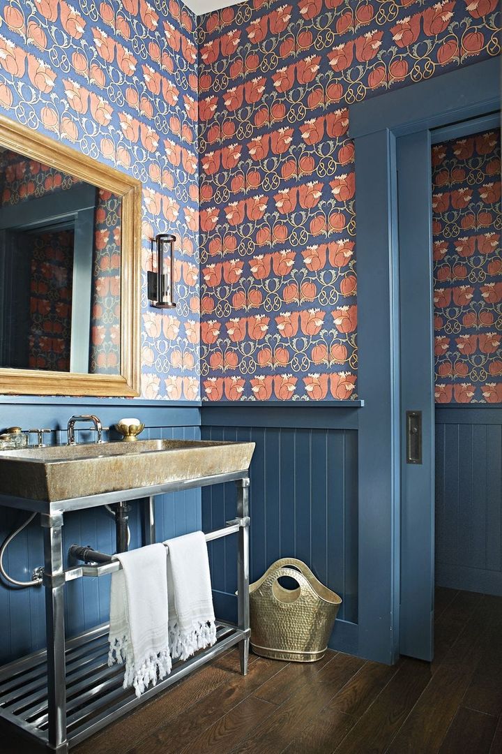 ダークな塗装で仕上げられた伝統的な腰壁。シカゴにあるこの家のバスルームでは、その端正な佇まいが、手描きによる活気に満ちた壁紙に、どこか凛とした気品を添えている。