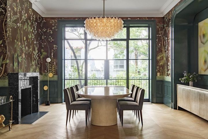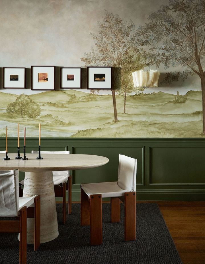 オーガスタ・ホフマンの自宅アパートメントの別の部屋では、腰壁がより凝った壁装飾を引き立てる“額縁”のような役割を果たしている。ダイニングルームでは、深いフォレストグリーンの腰壁を採用。その落ち着いた色合いが、壁面上部に施されたジェームズ・モブリーによるロマンチックな手描き壁画と、絶妙なバランスを保っている。