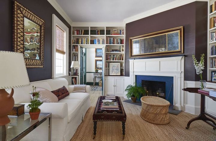 この図書室に、モダンさと心地よさを同時にもたらしているのは、白い腰壁の上に配された意外性のある深いプラム色。この目が覚めるような美しいコントラストが、シンプルな白いソファや「ジョン デリアン」のオットマン、そして「スターク」のクラシックなジュートラグと相まって、空間全体をいっそう引き立てている。