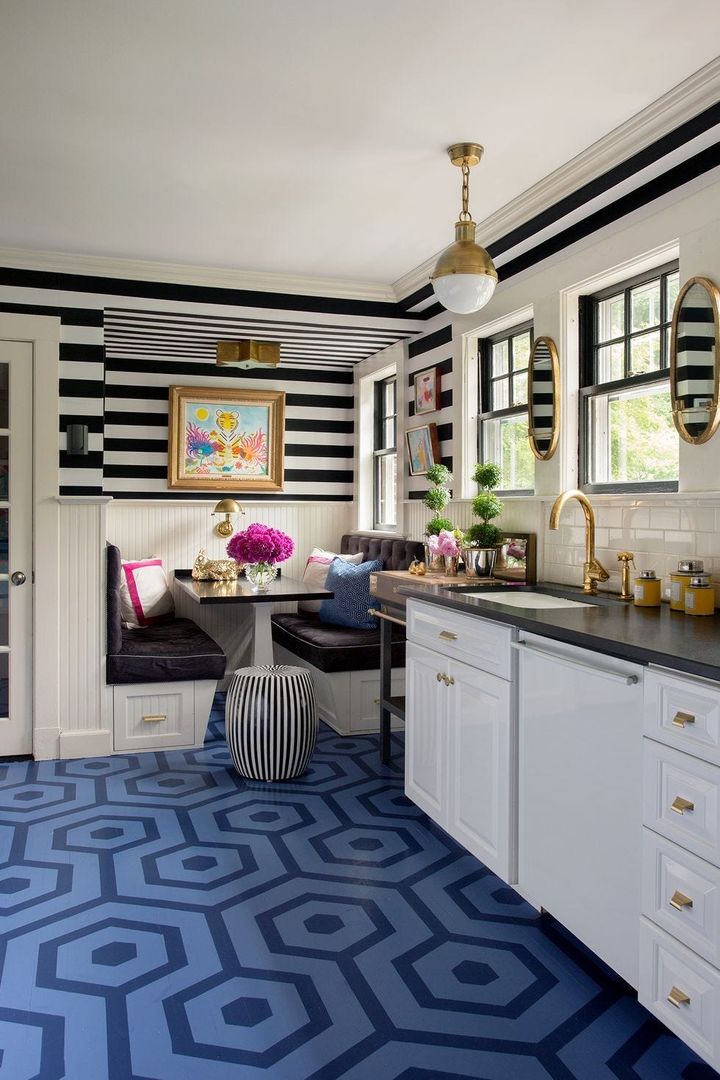 もしあなたの好みが、色や柄をふんだんに取り入れるデコラティブなスタイルなら、腰壁は異なる柄同士をうまく切り替える賢い手法になる。大胆なデザインが目を引くこの朝食スペースでは、ビードボードの壁がストライプの壁紙と塗装された床の間に配され、視覚的な“余白”として心地よいゆとりを生み出している。