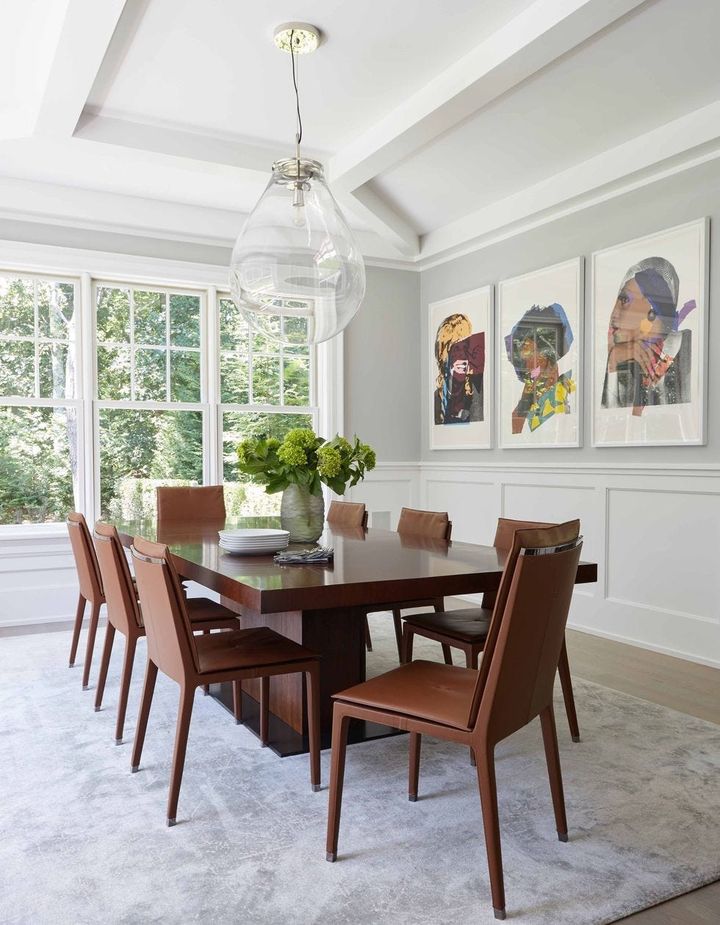 さりげなく、それでいて印象に残る腰壁を目指すなら、ブリジット・ロマネクが手がけたこの住まいを参考にしたい。落ち着いたニュアンスグレーの壁と白い腰壁が美しいコントラストを描きつつも、その組み合わせが主張しすぎることはない。あくまで主役であるアートやダイニングセットを引き立てる、絶妙な脇役に徹している。