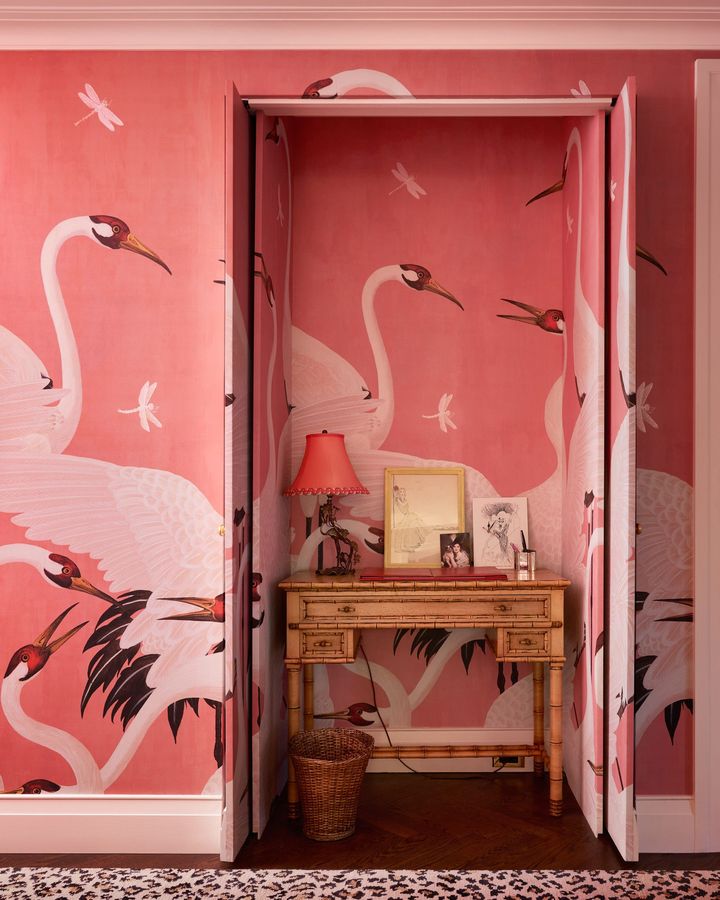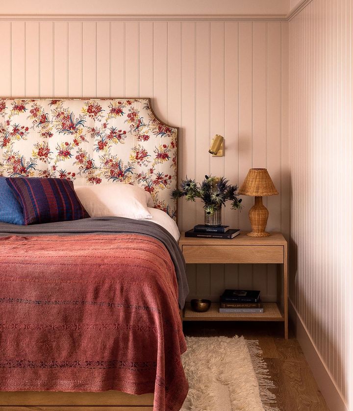 全体をブラッシュピンクで彩った腰壁は、華やかな花柄のヘッドボードを引き立てつつ、空間を軽やかに、そして広く見せる効果を生んでいる。また、サイドテーブルや照明に使われている天然木の質感やウィッカーの風合いとも自然に馴染み、心地よい調和を作り出している。
